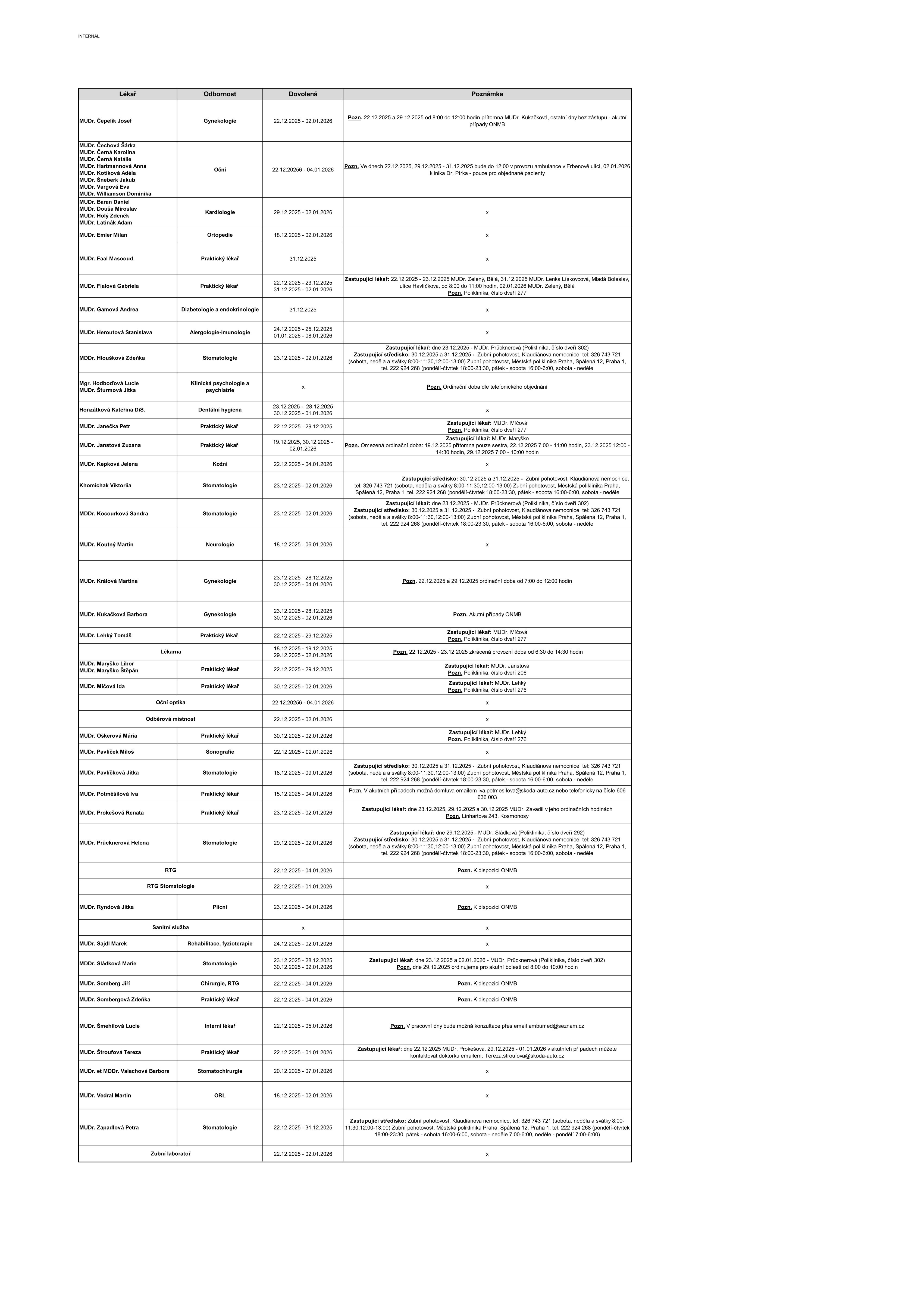 Přehled dovolených, omezení a dalších změn v ordinační době lékařů.