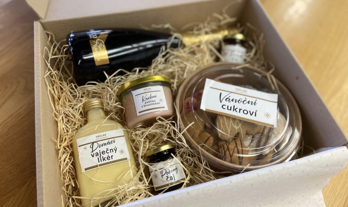 Order a Christmas gift box with products from Café Václav (egg liqueur, Christmas granola, pate) or a restaurant voucher.